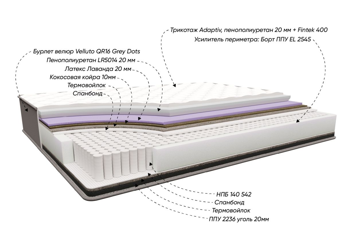 ППУ 2236 Уголь: Пенополиуретан с добавлением активированного угля, который поглощает запахи, нейтрализует бактерии. ППУ 5014: Другой тип пенополиуретана, отличающийся плотностью и упругостью. Этот слой придает матрасу мягкость и комфорт, распределяя нагрузку равномерно по всей поверхности.