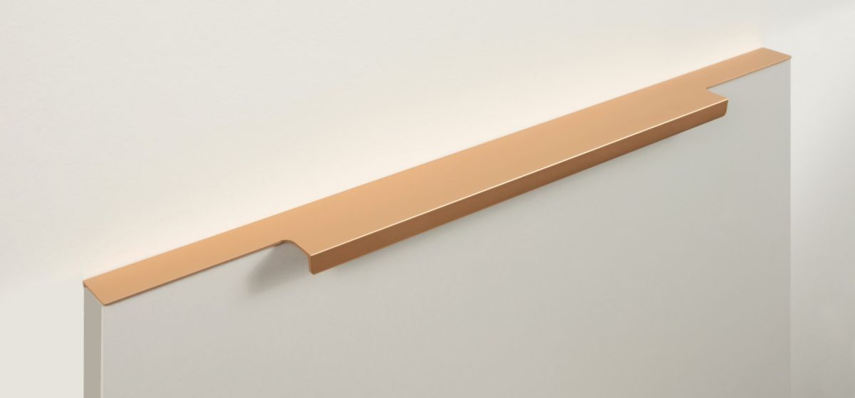 Ручка имеет богатую палитру цветовых решений и разнообразие длин. В зависимости от длины, модель допускает размещение двумя способами — «в размер» фасада и по центру широких фасадов (как большой «язычок»).