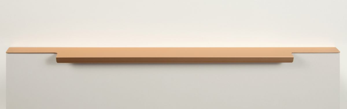 Ручка имеет богатую палитру цветовых решений и разнообразие длин. В зависимости от длины, модель допускает размещение двумя способами — «в размер» фасада и по центру широких фасадов (как большой «язычок»).