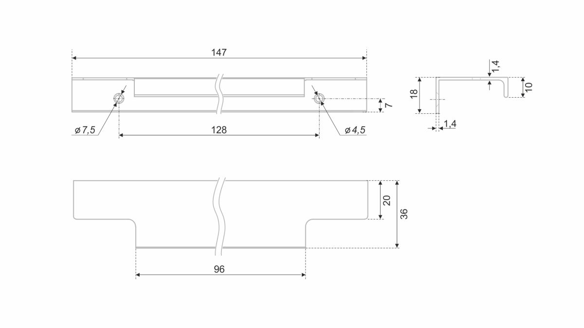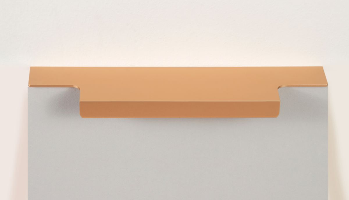 Ручка имеет богатую палитру цветовых решений и разнообразие длин. В зависимости от длины, модель допускает размещение двумя способами — «в размер» фасада и по центру широких фасадов (как большой «язычок»).